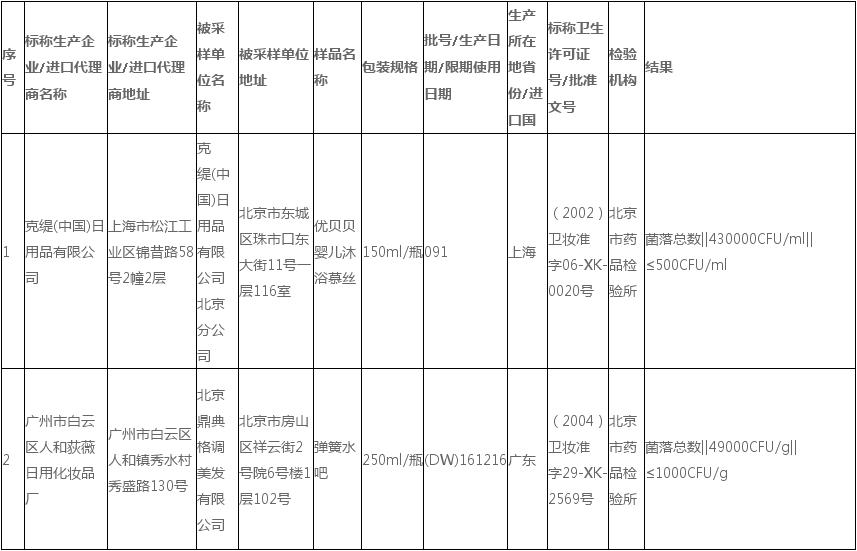 北京市食品药品监管管理局公布2017年下半年北京市化妆品质量安全公告。据了解,北京市食药监局2017年下半年完成化妆品监督抽检516批次,514批次合格,2批次不合格。其中,克缇(中国)日用品有限公司标称生产/进口代理的优贝贝婴儿沐浴慕丝菌落总数高达430000CFU/ml,较标准规定的菌落总数不高于500CFU/ml超860倍。