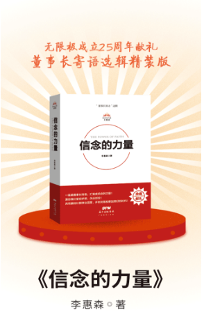 《信念的力量》一书,汇集了李惠森董事长20余年间所分享的公司发展方向、经营动态、企业文化和理念、做人做事心得体会等。通过阅读,伙伴们可以深入了解到公司快速发展的奥秘!作为新伙伴学习企业文化的工具,在晨会或小型活动上朗读和分享,将书中的知识、理念转化为自己的行动,激励伙伴们不管遇到多少困难和挑战,都要坚定梦想,永远创业!