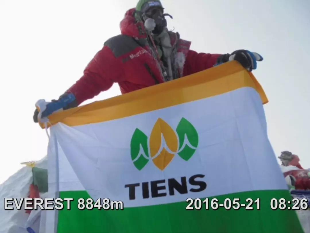 现场,来自蒙古国的天狮家人、运动员B.TSEVEENDASH先生,其母亲为天狮蒙古国八星经销商级别。TSEVEENDASH曾经数次登顶失败,同时身为成功商人以及医生资质的母亲,为儿子以天狮营养产品组合加强自身体质,在前后历经三次艰苦卓越的攀登努力后,终于在2016年5月21日8时26分,成功登上了海拔8848米的世界屋脊珠穆朗玛峰,坚持带着再多一克重量就超过负荷重量的天狮旗帜,首次飞扬在世界的屋顶。