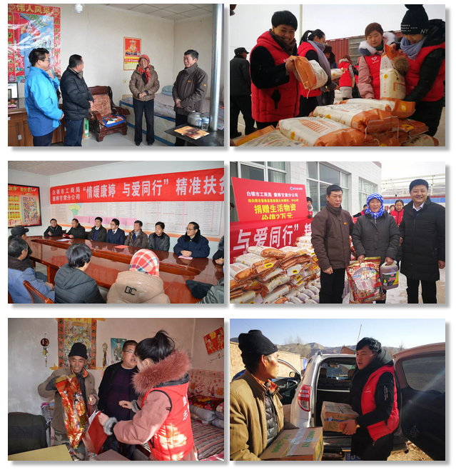 2018年1月30-31日,康婷爱心公益走进甘肃省白银市,在景泰县喜泉镇大水䃎村及中心村、白银区武川镇武川村开展了2场“情暖康婷·与爱同行”白银市精准扶贫关爱的公益活动,在隆冬腊月且新春佳节即将到来之际,康婷公司甘肃省分公司携康婷志愿者众鑫时代服务队与白银市及县区工商局领导一行,冒着风雪严寒为当地扶贫对象送去了亟需的米、面、油、过冬用煤、棉被等价值3万元的生活物资。康婷志愿者众鑫时代服务队也在本次公益活动中,自发自愿的筹款购买了新春礼包,在寒冷冬日里为受助群众送去融融暖意,用真情与爱温暖在场每个人的心。