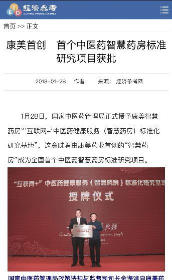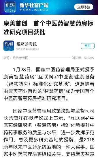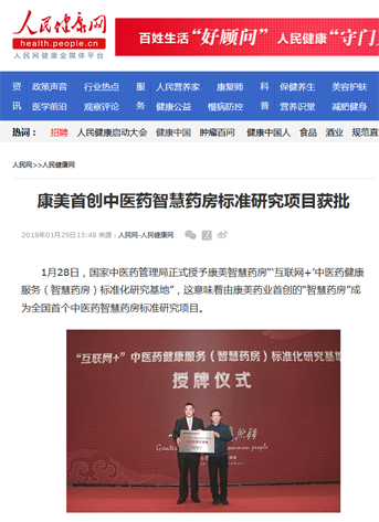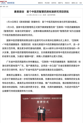1月28日,国家中医药管理局授予康美智慧药房“‘互联网+’中医药健康服务(智慧药房)标准化研究基地”,这意味着由康美药业首创的“智慧药房”成为全国首个中医药智慧药房标准研究项目。