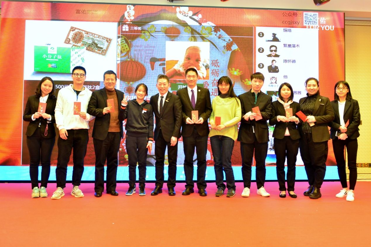 吴文广先生向全体员工做了2017年度总结和2018集团的展望。2018富佑开展了许多新项目,例如进军大健康产业、小呗呗项目、万店联盟项目,及小分子肽延伸的更多区域代理服务等,这些项目的初期,已让业绩飚升,未来可期。最后,他鼓励大家在未来的事业上,以冷静从容的态度面对人生的起起落落,对自己不失去信心,就是人生最大的成功。