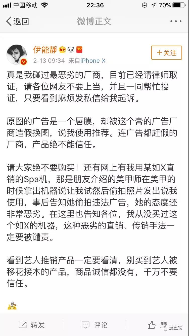 2月13日上午,伊能静发长文谴责无良厂商使用自己的肖像权卖唇膏,并透露自己已经请律师取证准备起诉。伊能静此前曾分享某品牌唇膜,却被无良商家偷图将唇膜换成唇膏,并以伊能静的旗号售卖。