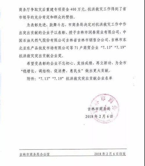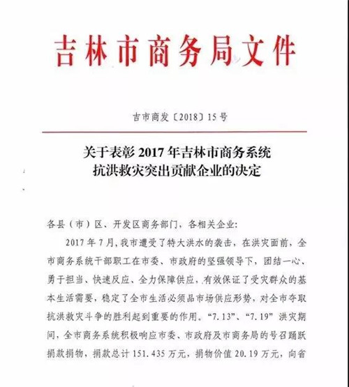 近日,云尚也在吉林市商务局下发的“关于表彰2017年吉林市商务系统抗洪救灾突出贡献企业的决定”的红头文件中受到了表彰,并获颁发“抗洪赈灾”纪念奖杯。云尚的义举,不但得到了家乡百姓的交口称赞,更是得到了政府部门的认可和肯定。