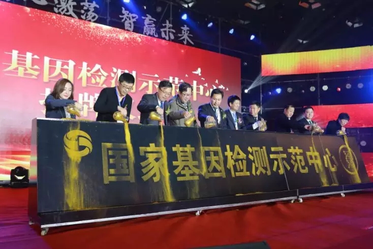 徐华锋副理事长,于耀处长,杨光副局长,朱永才副局长,李凯博士,珍奥集团陈玉琦董事长,双迪公司刘洪总裁、杨怡旗常务副总裁、张荣副总裁,晶泰公司李杰副总经理共同为双迪晶泰国家基因检测示范中心揭牌。随着金灿灿的细沙缓缓流入,“国家基因检测示范中心”以耀眼光芒落户双迪。