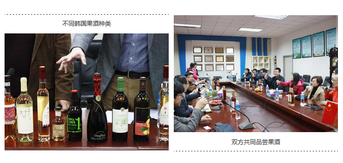 会中,双方共同品尝由韩国代表带来的韩国果酒,果酒种类涉及覆盆子酒、无花果酒等。并由韩国代表对韩国果酒的加工工艺、产业规模、果酒种类等进行讲解。