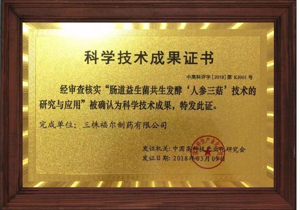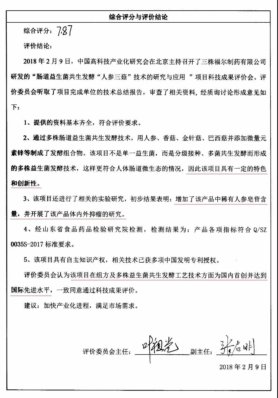 2018 年2月9日,中国高科技产业化研究会在北京主持召开了三株董事长吴炳新博士带领下研发的——“人参三菇”项目科技成果评价会。由中国中医科学院中药所、中国食品药品检定研究院、中国中医科学院、科技部火炬中心、中国医学科学院肿瘤医院、中国保健协会健康咨询服务工作委员会、中国医学科学院基础医学研究所等权威单位的从事药理、药物分析、肿瘤内科、基础医学等方面的多位专家组成评价委员会,听取了项目完成单位的技术总结报告,审查了相关资料对评价资料进行了审查,经严格质询和充分讨论形成了评价意见。