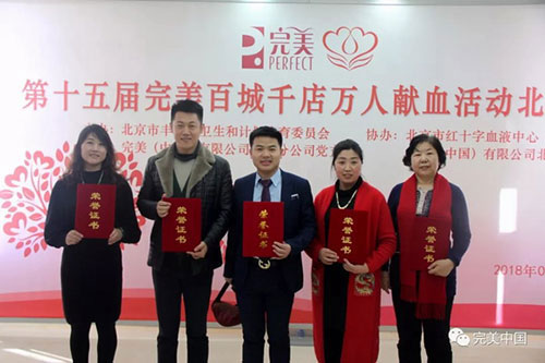 “3·15国际消费者权益日”当天,完美北京分公司用一种特殊的方式展示完美的诚信和品质。北京分公司联合北京市丰台区卫生和计划生育委员会、北京市红十字血液中心,在市血液中心举办“第十五届完美百城千店万人献血活动”。