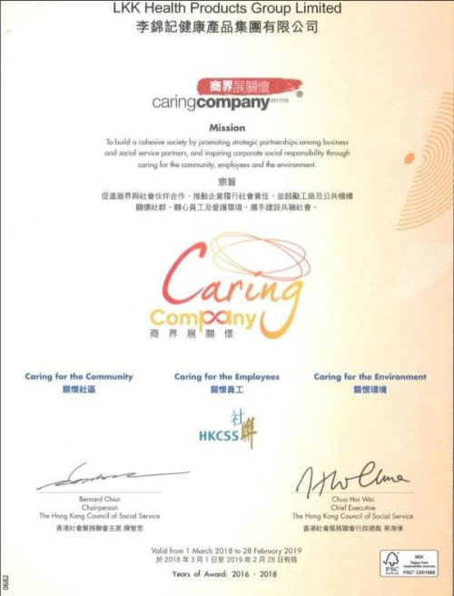 香港2018年3月28日电,李锦记健康产品集团(“集团”)再度获得香港社会服务联会授予“商界展关怀”标志,以表彰其为社区、员工以及环境所做出的关怀和努力。集团成员无限极(香港)有限公司则连续第四届获得“商界展关怀”标志。另外,集团再度获得由香港提升快乐指数基金与香港生产力促进局颁发“开心企业”的标志,肯定其贯彻履行员工责任并积极提升员工的工作快乐水平。