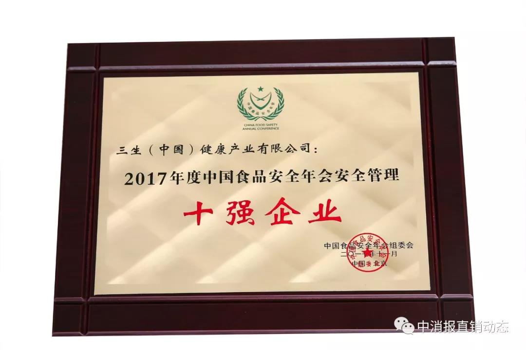 三生中国荣获2017年度中国食品安全年会安全管理“十强企业”称号。