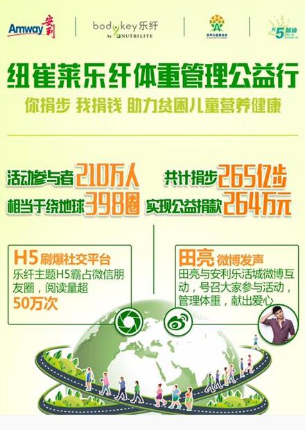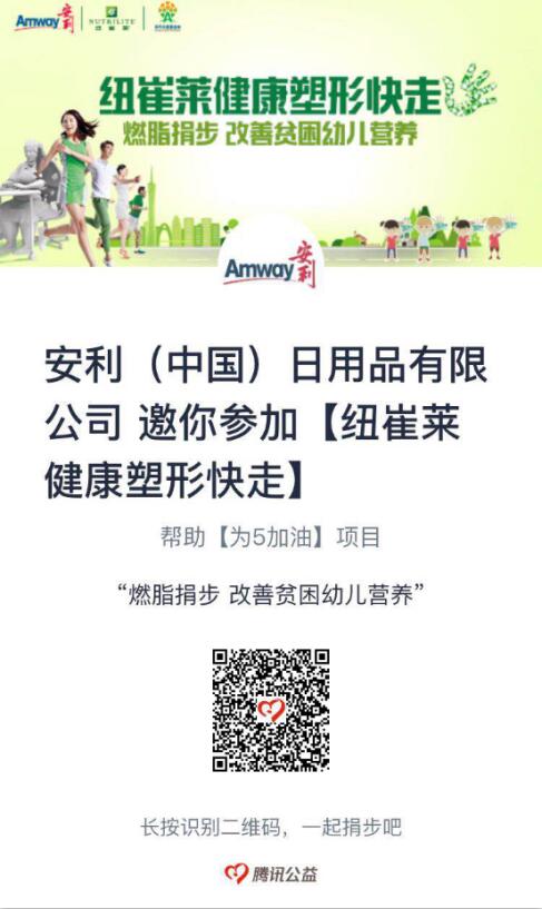 2016年,安利(中国)在腾讯公益平台发起“为5加油”公益捐步活动。2017年,安利纽崔莱乐纤体重管理公益活动在 50天内获得约180万个独立IP参与,覆盖210万人,累计捐步265亿步,可绕地球398圈,共为贫困地区儿童捐款264万元。