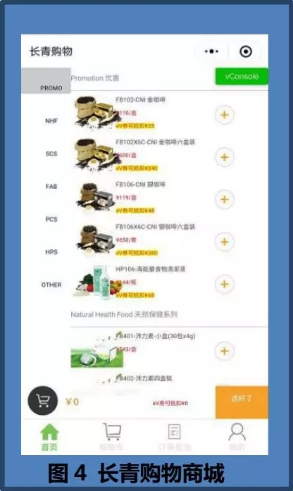 a. 普通顾客领取到 eV 优惠券后,可手机扫描或长按二维码进入长青购物商城(图4)选购产品,优选可抵扣产品并在付款时输入优惠券代码即可抵现使用(图5)。