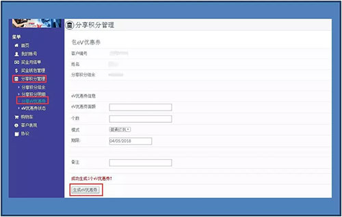 1. 在分享积分管理菜单中进行分享 eV 优惠劵:输入 eV 面额、个数,并设定期限,点击“生成 eV 优惠券”,就可以生成 eV 优惠券并分享啦(图1)。