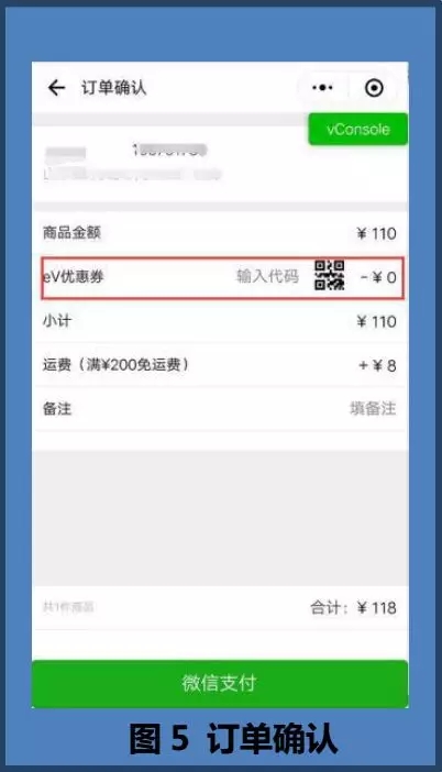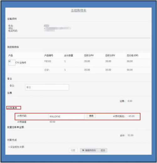 b. 经销商可通过经销商客户端选择订购,在“购物车”订购优选可抵扣产品,在最后付款时选择输入 eV 优惠券代码进行消费抵现使用(图6)。