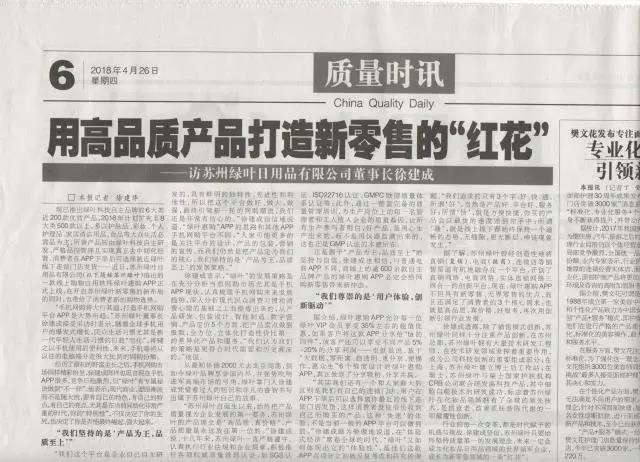 由国家质量监督总局主管的权威媒体《中国质量报》专访苏州绿叶日用品有限公司徐建成董事长,并刊文赞誉苏州绿叶高品质和新模式。