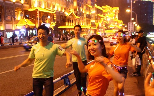 此次“星动夜走”沿重庆地标建筑,经洪崖洞-千厮门大桥-大剧院,一览网红城市五公里的绝美夜景。所以,不少喜爱运动的年轻朋友还在网红景点前快闪,向沿途的游客传递青春的火力和健康的生活。