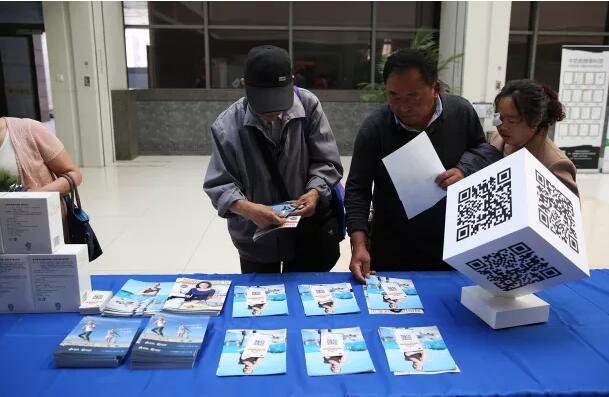 现场工作人员正在热心地帮助来往的人们扫描、下载由中国营养学会专家团队研发、葆婴有限公司支持的吃动平衡APP