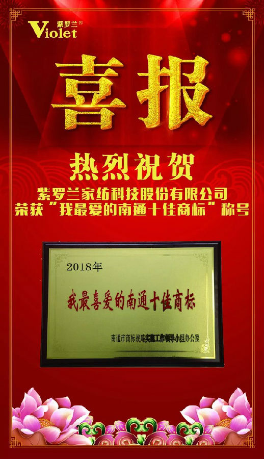 2018年,南通市商标战略实施工作领导小组办公室、南通市工商行政管理局联合举办了2018年“我最喜爱的南通十佳商标”评选活动。经过公众推选、微信投票、专家评审、综合评定,紫罗兰家纺有限公司商标当选为2018年“我最喜爱的南通十佳商标”。