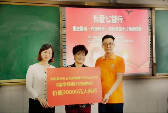 在綦江区关心下一代工作委员会的倡导下,安利重庆分公司向文龙小学捐赠了价值3万元的国学书法教材,给孩子更多机会接触国学,丰富了他们的课余生活。