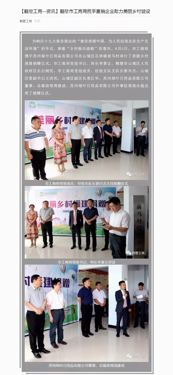 6月5日,苏州绿叶日用品有限公司在鹤壁市工商局众领导的见证下,举行了美丽乡村援建捐赠仪式。