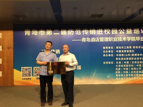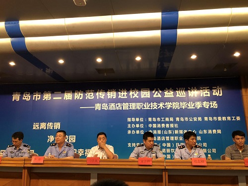 当天,在山东省青岛市工商局、公安局和教育工委指导下,由中消报(山东)新媒体中心和山东消费网共同承办的“青岛市防范传销进校园公益巡讲活动”走进了青岛酒店管理职业技术学院,在400余名师生的见证下,举行了隆重的“防范传销联络站”揭牌仪式,在座师生与现场嘉宾共话传销危害,提高防范意识。