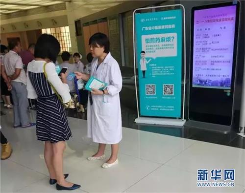 6月21日,广东省中医院大学城医院举行专家义诊活动,康美智慧药房工作人员向患者介绍服务,扫码关注康美智慧药房服务号,轻松查询药品物流配送实时状态,安全送到家中。