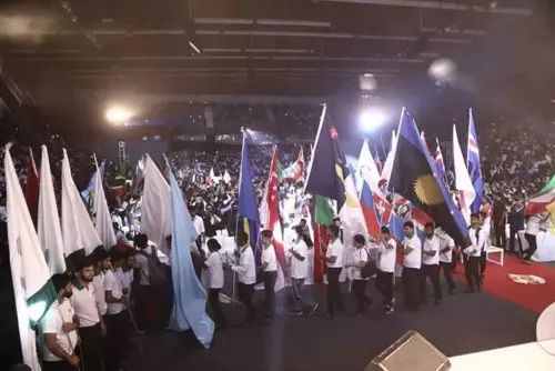 在雄壮的音乐声中,象征着天狮全球市场的各国国旗在印度旗手的高举中入场。