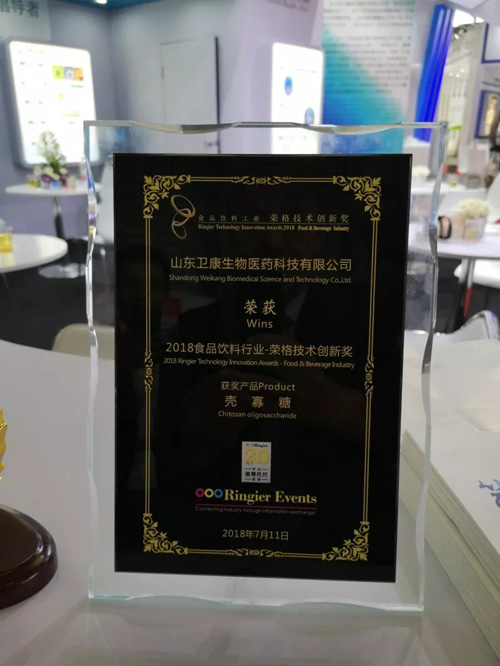 此外,凭借产品性能的优越以及整个团队的不懈努力,山东卫康生物医药科技有限公司荣获2018食品饮料行业--荣格技术创新奖和本次展会唯一的2018年度创新团队奖。这是对我们致力于壳寡糖研究与推广的最大支持与鼓励。