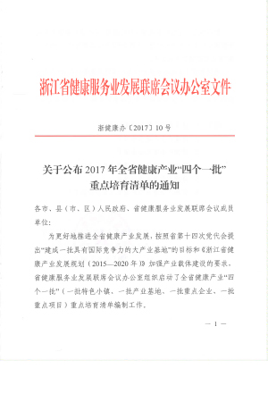 三生成为2017浙江省健康产业“四个一批”重点培育对象