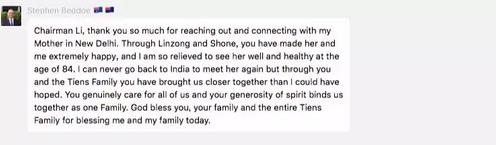 Mr. Stephen Beddoe在微信群中表达了对李金元董事长及天狮大家庭的的感激。Mr. Stephen回复说:"非常感谢李金元董事长惦念并联系我在新德里的母亲,通过李总和Shone的慰问,我和母亲非常感动与高兴。我看到母亲在84岁高龄仍然健康快乐感到很宽慰。我一直没能回到印度去探望她,但通过是你和天狮家人的探访,让我如同回到了母亲的身边,让我这个游子实现了愿望。董事长真心实意地关心我们,慷慨地包容我们,视我们为一家人。上帝保佑你!今天我深切地感受到了天狮家人保佑我和我的家人"