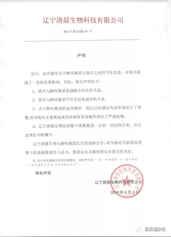 3日晚间,新浪潮杂志收到了来自清晨生物的官方声明,进一步确认了与广誉恒的战略合作,同时否认“收购或挂靠”: