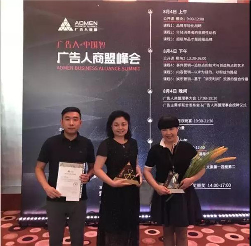 天士力大健康产业营销集团常务副总经理、天津帝泊洱销售有限公司总经理李荣,天士力控股集团品牌中心高级品牌经理吴量程与北京世纪润华广告有限公司副总经理高萍参加颁奖典礼。