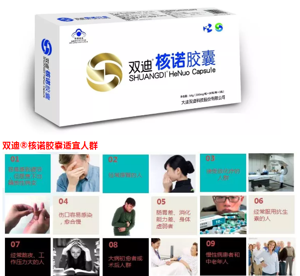 双迪®核诺胶囊,整合了生命体两大重要基础物质核酸(核苷酸)、蛋白质(肽、氨基酸)并复配牛磺酸、叶酸、维生素等微量元素的生物保健产品,多效合一,品质卓越。针对中老年人免疫机能减退、体内营养失衡、自由基堆积,进而导致生理功能出现退行性减退的特点,以 “小分子核苷酸 + 小分子肽”为主要功效成分,辅以牛磺酸、VC、VB6、叶酸 组成的核酸类保健品,通过调整机体机能,从根本上和整体上提升生命质量,让细胞跑起步来。