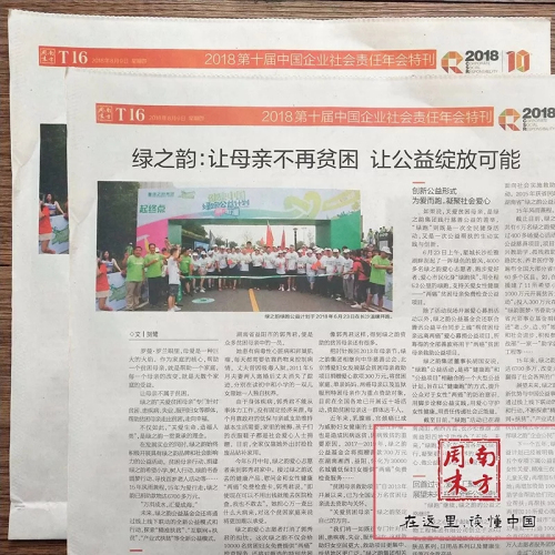 近日,《南方周末》刊登专题报道,以“绿之韵:让母亲不再贫困,让公益绽放可能”为标题,关注绿之韵集团“关爱贫困母亲”绿跑公益活动,对绿之韵在过去十五年公益路上,设立“低碳环保、女性关爱、精准三农、希望工程、绿+儿童关爱”等专项下属公益基金,履行社会责任方面所做出的努力和贡献进行了详细深入报道。