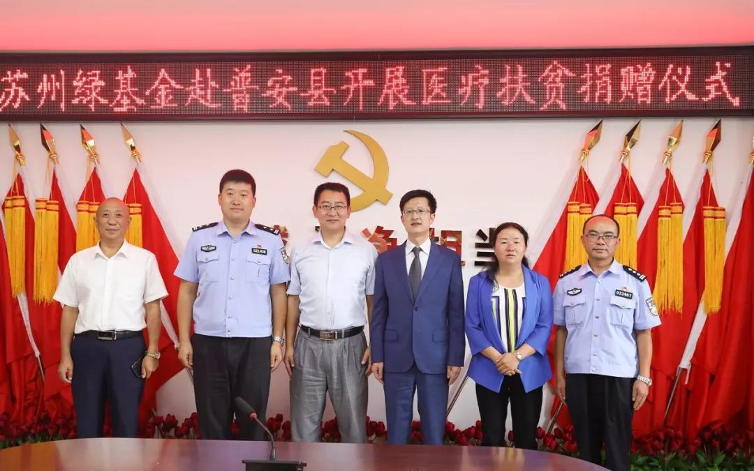 2018年8月31日,贵州省黔西南州普安县,群山葱茏,硕果飘香。在随同公安部宣传局局长战俊考察公安部对口扶贫地——贵州省黔西南州兴仁县、普安县之后,绿基金代表再次来到普安县,在公安部宣传局指导下,经普安县委、县政府,县公安局,县卫计局共同协调下,绿基金向普安县青山镇哈马村卫生室和盘水镇街道办卫生院共计捐赠援建资金231万元,医疗扶贫捐赠仪式在普安县公安局隆重举行。