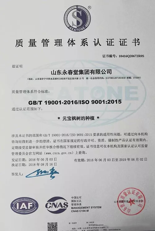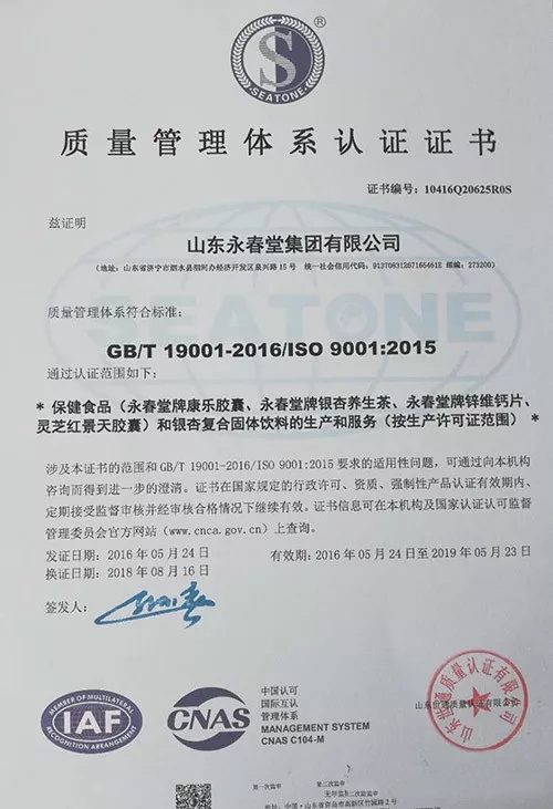 近日,山东永春堂集团有限公司顺利通过ISO9001质量管理体系复审认证,通过认证范围:保健食品(永春堂牌康乐胶囊、永春堂牌银杏养生茶、永春堂牌锌维钙片、灵芝红景天胶囊)和银杏复合固体饮料的生产和服务。元宝枫树的种植。
