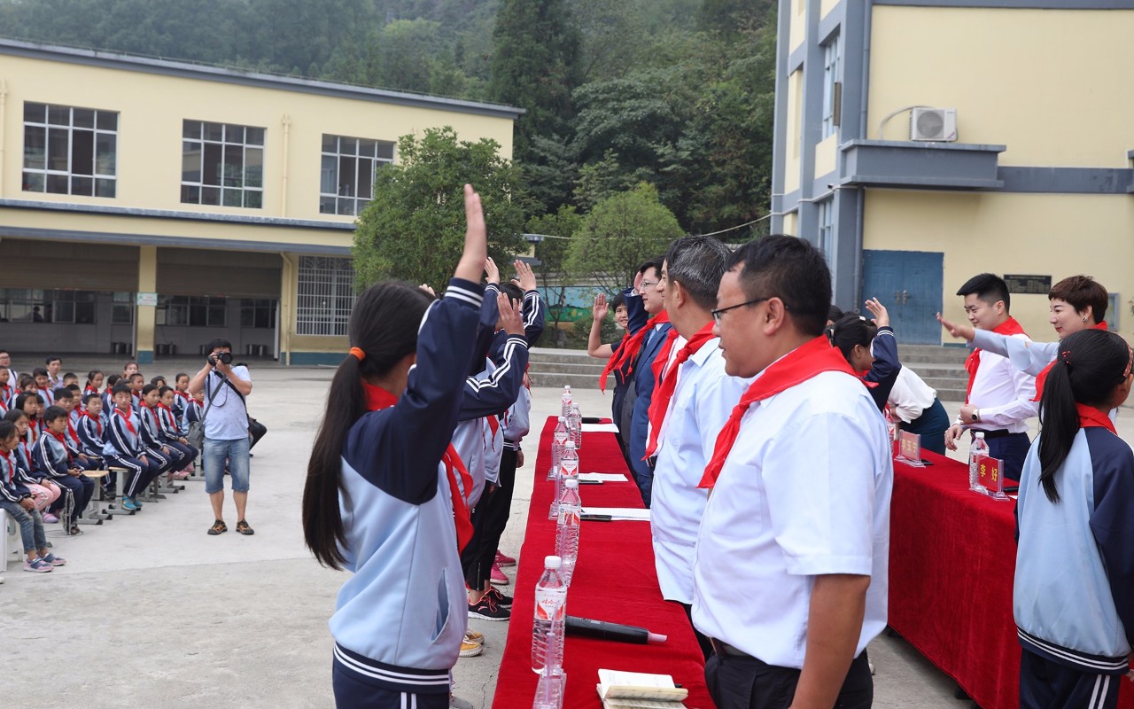 捐赠仪式由李维英镇长主持。伴随着欢快的《运动员进行曲》,少先队员们首先为主席台就座的领导系上鲜艳的红领巾,并敬礼致敬。