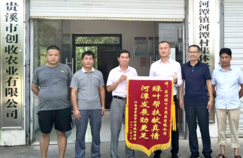 绿叶科技集团外事部高级经理戴兵代表绿基金公益基金会向江西省贵溪市河潭镇河潭村一次性捐赠三万元,用于购买水泵等物资,解决当地农田灌溉等用水问题。