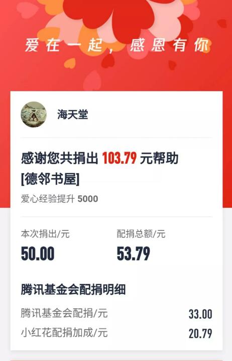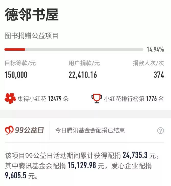 在所有爱心人士的共同努力下,加上腾讯公益基金的配捐,短短数小时的时间,德邻书屋项目收到的善款就已接近5万元了,这些钱已可以支持我们为小区的孩子们修建一间德邻书屋了。