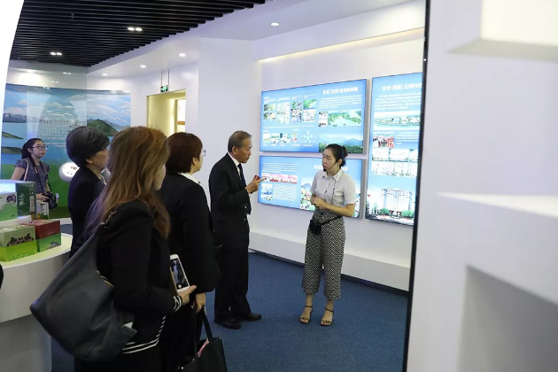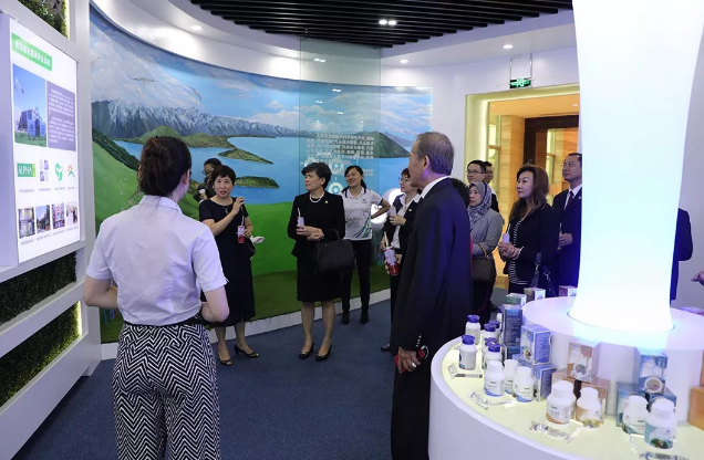 ▲访问团边畅饮安发健康饮品边参观安发文化馆