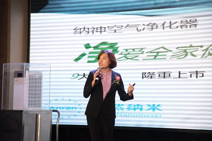 安然商学院院长助理刘一飞女士为伙伴们解读了安然纳神空气净化器的9大亮点:高于新国际最高标准;大面积快速净化空间;负离子净化;2层滤网3网合一4重过滤;精准传感器,实时监测空气质量;耗能低,寿命长;360度无死角净化;睡眠模式,噪音低至34分贝;贴心设计,省心无忧。通过现场净化速率的实验等,展示了安然纳神空气净化器的突出效果,掀起发布会现场的高潮。
