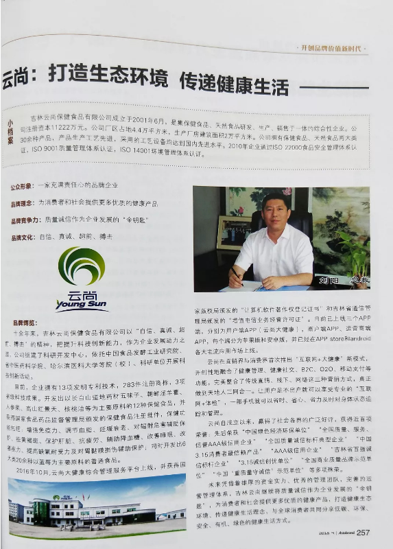 今天,吉林云尚已拥有国家批准的保健食品12种,天然食品6大类30余个品种,更多匹配生态家庭的系列健康产品正在国内外多维研发、测试。采用专利技术生产的蓝莓系列产品,采用北纬41度长白山有机产品认证专属基地的生态蓝莓,引进最先进的低温萃取科技,最大程度确保核心成分花青素的活性与效能。超越中国蓝莓深加工产业最高标准,使“生态蓝莓”成为云尚一张实力名片。