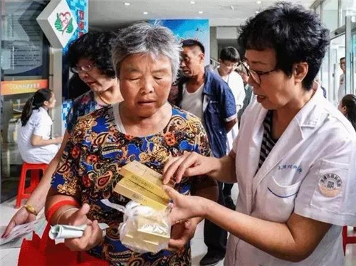 工作人员向义诊百姓赠送由天津和治友德制药有限公司捐赠的南新钙片保健品