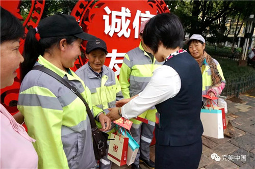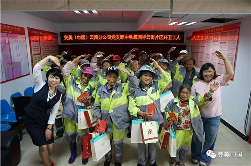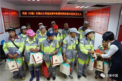 9月19日,在中秋节来临之际,完美云南分公司党支部为昆明市祥云街片区20余名环卫工人送去爱心月饼、节日慰问品及慰问金,感谢他们用勤劳的双手,带给城市清洁和美丽。