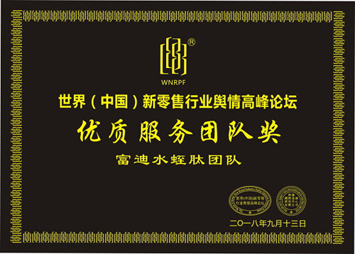 主办方对获奖系统的颁奖词表示:富迪水蛭肽团队以卓越的产品品质,为千万家庭带去健康生活;他们以至臻完善的服务,让消费者享受切实的体验;他们以专业的素养,一路披荆斩棘,筚路蓝缕。让团队的优质服务成为广大消费者心灵的港湾!他们是为消费者提供优质服务的典范!这无疑是对富迪水蛭肽团队极大的肯定和认可。