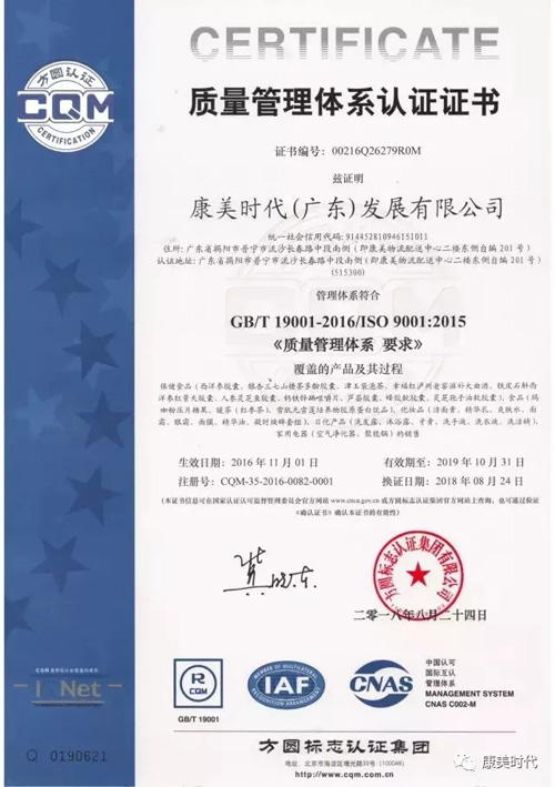 近日,经权威机构的专业认证,康美时代再一次拿下ISO900:2015最新版质量管理体系认证证书。自2016年起,康美时代连续三年顺利通过认证,充分印证了“康美出品,必属精品”的产品理念。