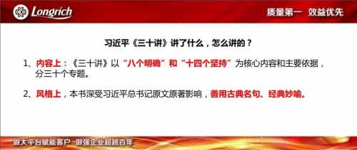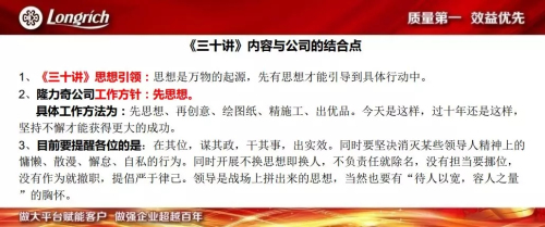 今天的早礼上,隆力奇党委书记徐之伟上专题党课,内容为学习《习近平新时代中国特色社会主义思想三十讲》(以下简称《三十讲》)。《三十讲》给我们的启发是思想引领,思想是万物起源,先有思想才能引领到具体行动中。