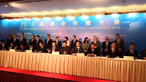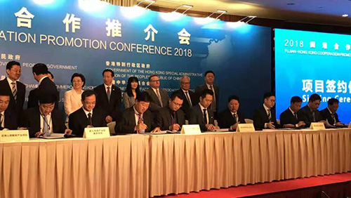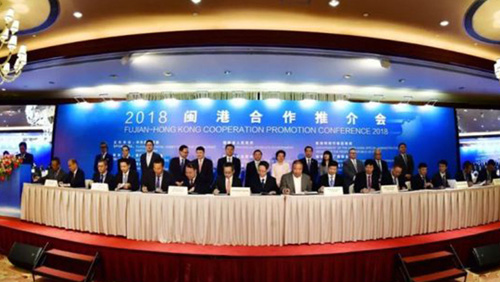 2018年10月9日上午,由中共福建省委、福建省人民政府和香港特别行政区政府联合主办的闽港合作推介会暨闽港重点合作项目签约仪式在香港举行。活动以“新时代•新征程•新发展”为主题,向到场香港各界代表介绍了福建省的发展成果和营商机遇,并举行30个闽港合作重点项目的签约仪式。