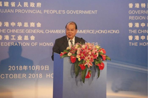 香港特别行政区政务司司长张建宗在致辞中表示,香港特别行政区政府始终高度重视、积极推动闽港交流合作。香港和福建各自都有独特的优势和特质,未来闽港两地一定能继往开来,开拓更广阔的合作空间,携手推进“一带一路”建设和两地经济社会发展。