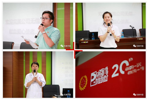 完美业务中心副总经理王贺代表公司讲话,她肯定了完美人对无偿献血事业的不懈付出,鼓励大家积极加入无偿献血队伍,参与造血干细胞和机采成分血捐献,造福更多人。